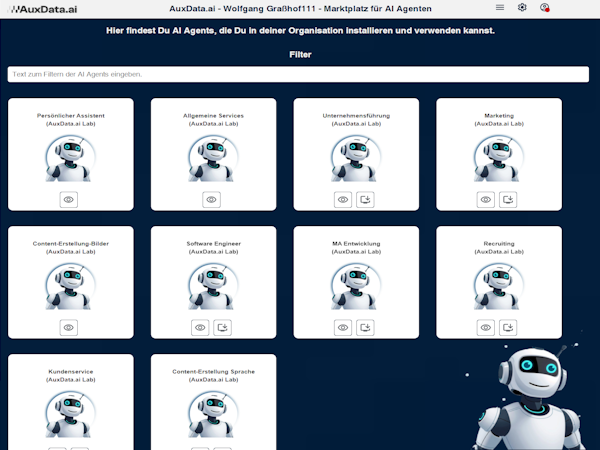 Erstellen Sie eigene Assistenten, um die vordefinierten Anwendungsfälle zu ergänzen. So wird aus AuxData.ai ein individuelles KI—Betriebssystem für Ihr Unternehmen, das Sie jederzeit anpassen und erweitern können.