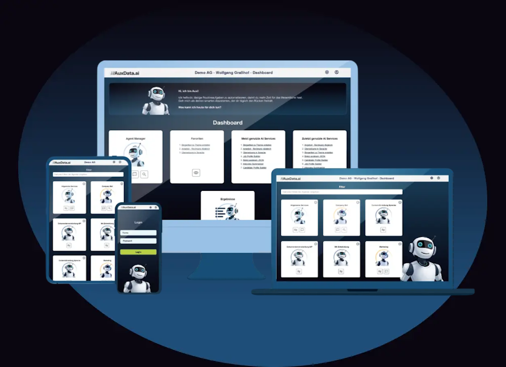 AuxData.ai öffnet Ihrem Unternehmen das gesamte KI-Universum in einer sicheren Plattform. Stellen Sie jedem Team und jeder Ihrer Fachkräfte genau die KI-Services zur Verfügung, die Ihre Arbeit effizienter machen. Ohne Experimente und Datenschutzrisiken.